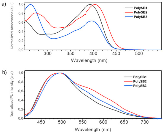 The optical properties of polySBs were studied through UV-vis absorption and photoluminescence measurements using diluted polymer solutions. As shown in Figure 5a, all polySBs exhibited two well-defined UV-vis absorption bands at around 270 and 400 nm corresponding to π–π* and n–π* transitions of the conjugated system and both TPA and imine moieties, respectively [7,44,45]. PolySB2 exhibited the highest maxima absorption at 473 nm (λ onset, Table 2). The results suggest that the absorption of the polySBs are closely related to the content of aromatic rings and the substitution pattern (polySB1 < polySB3 < polySB2). Thus, polySB2, with a p-substitution in their biphenyl moiety, shows a red-shifted maximum absorption band (403 nm) which would be attributed to the difference of dihedral angle between the phenyl and biphenyl moieties. Furthermore, a higher degree of effective conjugation lengths can enhance the degree the π-electronic delocalization in the biphenyl-imine-triphenylamine segments [7,44,46].