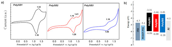 Cyclic voltammograms of polySBs in 0.1 M Bu4NPF6 in dichloromethane, at a scan rate of 100 mV s−1 (a) and energy levels (b).