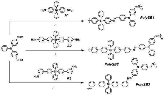 PolySBs were prepared from a commercial aromatic dialdehyde (bis(4-formylphenyl)phenylamine) and three silylated diamines containing TPS-cores (A1-A3). All samples were obtained by a high-temperature polycondensation reaction using p-toluenesulfonic acid (PTSA) as a catalyst in anhydrous DMAc (Scheme 2). The polymerizations were carried out under N2 atmospheric conditions [29,39].