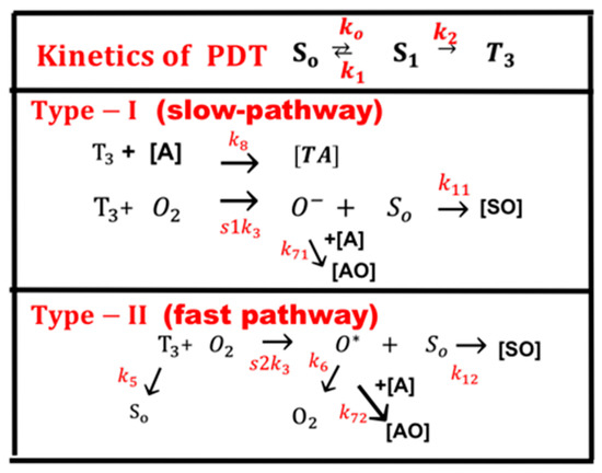 As shown in Figure 1, in the type-I pathway, the excited PI triple-state (T3) can interact directly with the substrate (A); or with the ground state oxygen (O2) to generate a superoxide anion (O−), which further reacts with oxygen to produce reactive radical (O−). In comparison, in the type-II pathway, T3 interacts with the ground state oxygen (O2) to form a reactive singlet oxygen (O*). In general, both type-I and type-II reactions can occur simultaneously, and the ratio between these processes depends on the types and the concentrations of PI, substrate, and oxygen, the kinetic rates involved in the process [36,37].