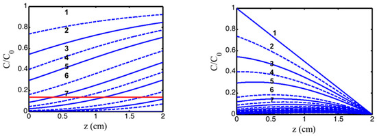 The normalized photoinitiator concentration profiles for uniform (left figure) and non-uniform (right figure, with D = 1.0 cm) PI initial distribution, for t = 0 (curves 1) and t = 50, 100, 150, 200, 300, 350 s (curves 2 to 7) with quantum yield q = 1.0, a’ = 0.2(mM·cm)−1, b’ = 0.15 (mM·cm)−1, and Q = 0.1 (1/cm) [34,35].