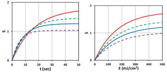 Curing (crosslink) depth (zS), crosslink time (TC), and induction time (TD) have been calculated by Lee et al. [28], Cabral et al. [27], Hatanaka [29], and Lin et al. [34,35] based on various definitions. Lee et al. [28] defined the critical threshold for gelation by a critical conversion at which point a gelation is formed. Cabral et al. [27] presented numerical results for the general case, but their analytic formulas, Equations (5) to (8), are only for the thin-film cases in which the PI bleaching was ignored. They defined an “induction time” (TD) given by a measured threshold efficacy of 5% to 0.95%, depending on types of materials. The associate moving front (solid/liquid interface) was defined as a cure depth (zC), shown by their Equation (7). Cabral et al. [27] also defined a “saturation time” (TS) given by their Equation (8) sat as the time required for full (99%) conversion of the resist layer of a given thickness. In comparison, this study defines TS based on Equation (5), when S reaches 87% (or 1−e−1) of its steady-state.