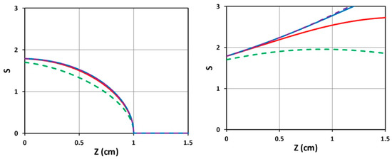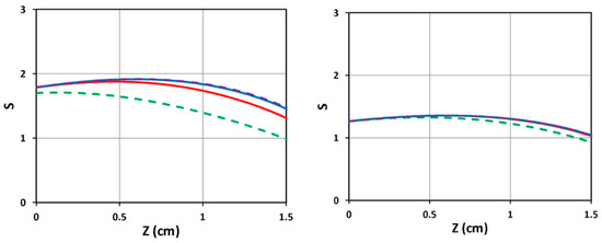Figure 6 shows S versus PI concentration (C0), for z = 0 and 0.5 cm, for D = 1.0 cm, I0 = 10 mW/cm2. Figure 7 shows profiles of S versus light intensity (I0), for z = 0 and 0.5 cm, for =pD = 1.0 cm, C0 = 2 mM, for t = 100 s (red curve) and 200 s (green curve). Figure 8 shows the spatial profiles of S based on the analytic formula of Equation (5), with fit parameter m = 0.001, for various PI concentrations at C0 = 2.0 and 3.0 mM, and various exposure times (for the case of uniform distribution, with D ≫ 10 cm). Figure 9 shows numerical results for S versus PI concentration at various times, t = (100, 200, 400) s, at thickness z = 1.5 cm, and for D ≫ 1.0 cm (F = 1).