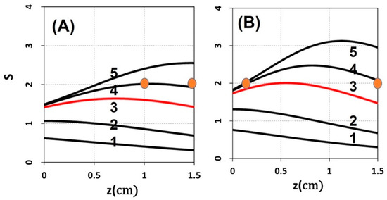 Spatial profiles of S for various PI concentration: (A) C0 = 2.0 mM, (B) C0 = 3.0 mM, at exposure time t = (30, 70, 165, 250, 400) s, with a’= 0.6, b’ = 0.1 (1/mM/cm), Q = 0.5 (1/cm), and I0 = 10 mW/cm2, using the analytic formula of Equation (5) with fit m = 0.001.
