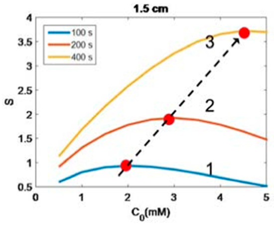 Numerical results of S versus PI concentration at various time, t = (100, 200, 400) s, for curves (1, 2, 3), at z = 1.5 cm; also shown are locations of the optimal concentrations (shown by red dots), which are increasing function of time (or light dose) (shown by dashed line).