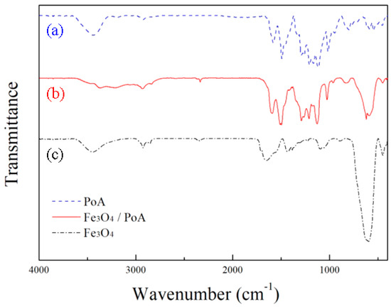 Figure 4. FT-IR absorption spectra of (a) POA, (b) Fe3O4/POA, and (c) Fe3O4.