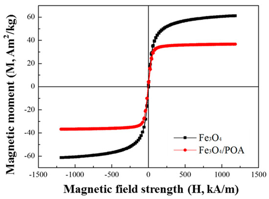 On the other hand, Figure 5 shows the magnetic hysteresis curves of both Fe3O4 and Fe3O4/POA particles tested using the VSM, in which the magnetic moment was measured as a function of the magnetic field strength of −1200 kA/M at 1200 kA/m. The two different magnetic particles showed different magnetic moment values, particularly that the Fe3O4/POA particles had a magnetization close to the saturation state of 36 emu/g while the Fe3O4 powder had that of 61 emu/g. These values indicated that the magnetic properties of the magnetic particles coated with polymer decreased, and the density of Fe3O4/POA coated with conductive polymer POA decreased from 4.34 g/cm3 to 2.52 g/cm3. This reduction in saturation magnetization was due to the introduction of a non-magnetic POA-coated shell.