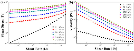 In order to study the MR characteristics of the Fe3O4/POA core/shell particles, a magnetic fluid of 10 vol % was prepared using silicone oil having a density of 0.965 g/cm3 (KF-96-100cSt, Shin-Etsu Silicone). The MR performance was measured using a rotational rheometer in a controlled shear rate (CSR) mode. Figure 6 shows the constant steady shear behavior of the MR suspension. Tests were conducted with changes in a shear rate between 0.01 and 200 (/s) using the MR suspension based on Fe3O4/POA core-shell particles. The measurement interval was set from the initial 10 s to the final 0.5 s through the log–log scale of each sweep test. The resulting flow curve response was investigated as a function of field strength in the range of 0 to 342 kA/m. Without the magnetic field, the shear stress and shear viscosity increases linearly associated with the Newtonian fluid behavior, whereas the magnetic field increases the shear stress and shear viscosity of the MR suspension. Following the Herschel–Bulkley model when a magnetic field is applied, a linear behavior with increasing slope in the sense of a high shear rate in the low shear rate range was observed in a relatively log–log plot. As expected, the shear stresses obtained as in previous studies using MR suspensions tend to be highly dependent on the applied field strength. Due to strong dipole interaction between adjacent core-shell magnetic particles, a solid column is formed and typical MR behavior is shown. As shown in Figure 6b, the shear thinning behavior was observed in MR fluid at a fixed magnetic field strength. For the shear viscosity of MR suspensions, the shear rate is reduced as the structure increases, and the characteristics of non-Newtonian fluids with shear losses due to structural deformation and fracture are shown [28,29].