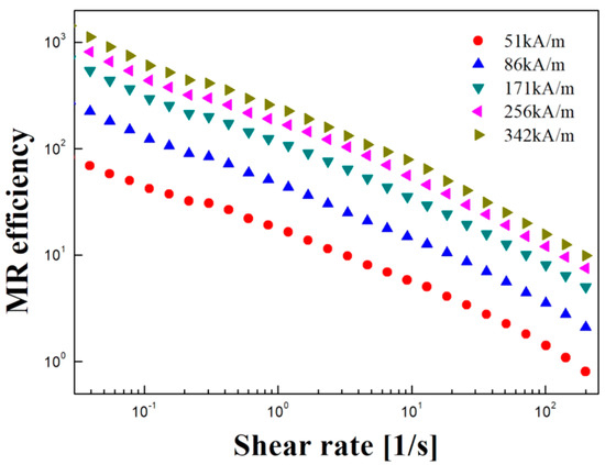 In Equation (1), τ0 and η0 are shear stress and shear viscosity, respectively, in the absence of applied magnetic field, and τM and ηM are shear stress and shear viscosity under applied magnetic field [30]. As shown in Figure 7, the relative value of magnetic efficiency increases with increasing magnetic field strength, and it decreases sharply with an increasing shear rate when the magnetic field is applied. This indicates the gradual destruction of the internal structure of the MR suspension that was forming the chain by the magnetic field when an external stimulus was given. For the controlled shear rate mode data, the shear stress results were analyzed using a commonly used rheological model of a Herschel–Bulkley rheological equation of state of Equation (2) for each magnetic field;