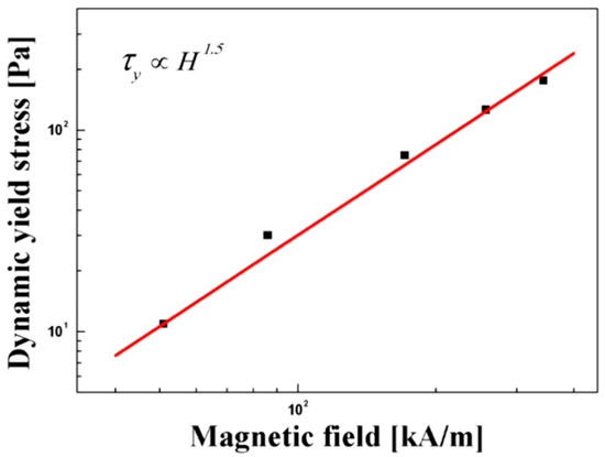 In Figure 8, the dynamic yield stress which was obtained by extrapolating shear stress to zero shear rate was reanalyzed as a function of the magnetic field strength for the Fe3O4/POA-based MR suspension. When there are external stimuli such as magnetic field (H), the plot shows the exponential relationship between dynamic yield stress and H as given in Equation (3);