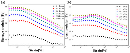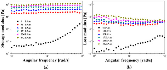 The amplitude sweep test was performed initially to determine the linear viscoelastic region (LVE) at a constant angular frequency of 6.28 rad/s in a strain range of 0.001–100%. Figure 9a,b shows the storage modulus (G′) and loss modulus (G″) as a function of shear strain with a magnetic field. In the low strain region, both moduli were independent of the strain in the LVE region, and a specific strain (0.005%) was chosen for each strain sweep test. G′ and G″ decreased as a result of irreversible structural changes in the MR suspension when the applied strain was increased sufficiently above the plateau region. When the magnetic field is applied, the MR suspension forms a solid structure while forming a chain during a state change from a liquid state to a solid state. The values of storage modulus (G′) and loss modulus (G″) were measured by the frequency sweep test after defining the LVE area of 0.005% according to the results of the amplitude sweep test in Figure 9.