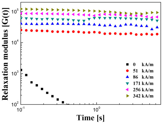 As shown in Figure 10, when a magnetic field was applied, G(t) had a substantially constant value and increased in proportion to the intensity of the magnetic field. This indicates that the chain structure formed in response to the applied magnetic field behaves like a solid. When there is no magnetic field, G (t) decreases with time [33,34].