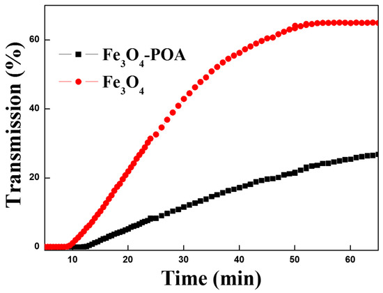 Figure 12. Transmission profiles of pure Fe3O4 and Fe3O4/POA MR suspension.