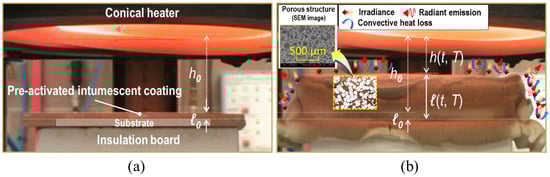 Thermo-physical behaviour of an inorganic-based intumescent coating tested with cone calorimetry: (a) in the initial state and (b) in the fully-expanded state, where ℓ, h, and SEM refer to the thickness of the coating, the distance between the heater and the coating’s exposed surface, and scanning electron microscopy while the subscript 0 indicates the initial state.