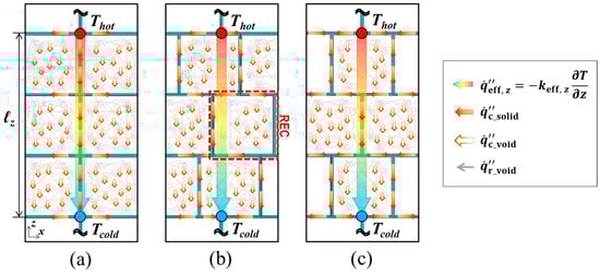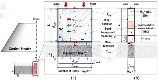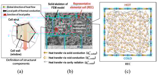 - This numerical simulation also considered the influence of radiative heat absorbing into and emitting from the strut and wall of the pores smaller than the RECs, as illustrated in Figure 2a,b. RECs were therefore regarded as being filled with a mixture of the strut/wall of these smaller pores and air (i.e., a semi-transparent medium).