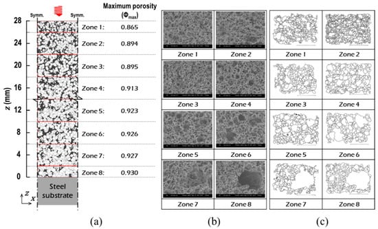 Data obtained from the electric furnace tests: (a) schematics of the porosity distribution along the coating thickness, (b) the SEM images, and (c) the corresponding void boundaries.