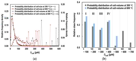 To determine the size of the representative elemental cells (RECs), we completed a topological analysis on the SEM images. Based on the void boundaries highlighted with black lines in Figure 4c, two types of probability distributions were obtained: (1) cell-diameter (δcell) and (2) cell-volume (Vcell), as illustrated in Figure 5a. Vcell indicates the volume occupied by each of the similar-sized groups of pores, if the pore is assumed to be spherical in shape. We found that microscopic pores in a range between approximately 5 μm and 650 μm coexisted. The peak relative frequency densities of δcell (solid lines with round symbols) were observed when the δcell was between approximately 5 μm and 25 μm at both temperatures of 300 and 600 °C. However, the tendency of the relative frequency density distribution of δcell disagreed with that of Vcell (dotted lines with cross symbols).