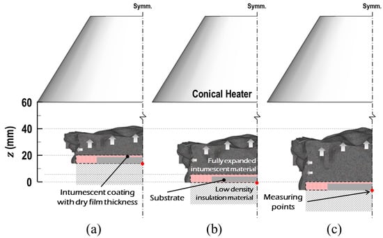 - The exact quantity of irradiance on the exposed surfaces of a specimen placed in CC was thoroughly scrutinised in a previous study []. This knowledge of the sample’s thermal boundaries in CC testing enabled us to concentrate on investigating the interred heat transfer mechanism. Unlike EF, CC simultaneously enables the real-time observation of both volume expansions and temperature increases. These favourable features contributed to the evaluation of the thermal insulation performance of the inorganic intumescent coating as well as to the verification of the numerical predictions.