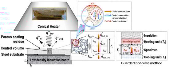Heat transfer through a porous medium has been conventionally considered as combined heat flows [], such as thermal conduction along its solid matrix, thermal radiation across internal pores, and either thermal convection by or conduction through gases filling the pores. With respect to the latter unavoidable selection between convective and conductive heat flux in gas-filled pores, convective heat transfer is suppressed within pores smaller than approximately 10 mm [,]. As such, the majority of the pores of the coating-residue studied in this article are expressed on the micron scale, as shown in Figure 1b. In addition to this simple approach, the either/or choice can be completed based on the principle of temperature-fluid motion relations. A previous study [] stated that the temperature of the heat source in CC (i.e., the spiral coil of the conical heater) remained in the range of approximately 579 to 752 °C at standard irradiance between 25 and 50 kW/m2. Under these temperature conditions, the gaseous phase had a Rayleigh number lower than 102, and thus had an average Nusselt number close to unity [,,]. This indicates that the interred generation of buoyancy-induced fluid motions was negligible within the micro-scale pores of the coating-residue. In other words, this heat transfer mode can be regarded as a ‘pure’ conduction through motionless gases. Therefore, in this work, the total heat flux transferring across the fully expanded coating, , is specified as the heat transfer via solid conduction, ; void conduction, ; and void radiation, , as follows: