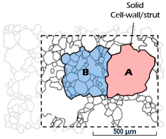 As a practical solution method to model this sporadic formation, we only shaped the dominant route of solid conduction in the FEA in this study. Figure 2 describes the scheme of this approach, and illustrates a structured multicellular model superimposed on an SEM image of the fully expanded intumescent coating. The model was composed of a solid skeleton and clonal RECs. With regard to the shape of the RECs, at higher levels of porosity than approximately 0.8, the shapes of the inclusions and cross sections of the struts have minor effects on the thermal conduction along the continuous solid matrices of polymeric media with low conductivity [,]. Coquard et al. [] claimed that numerical models with homogenous dispersions of regular voids enabled the reliable estimation of effective thermal conductivity compared to those with real foams observed using tomographic images. Hence, in this FEA simulation, we modelled the mode of solid conduction as occurring along the structured dominant-conduction-route.