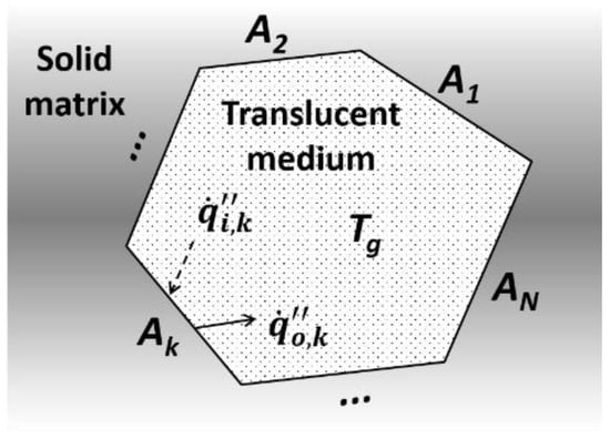 In order to simulate the radiation transfer through the voids of the inorganic intumescent coating, we formulated a radiation-exchange mechanism in a unit enclosure using the extended net-radiation method []. This general form of enclosure was assumed to be composed of N discrete internal surface areas and filled with a semi-transparent isothermal medium with Tg, as shown in Figure 9. The energy balance for a solid-phase control volume (Vk), adjacent to the kth internal surface area (Ak) of the concave, was derived as: