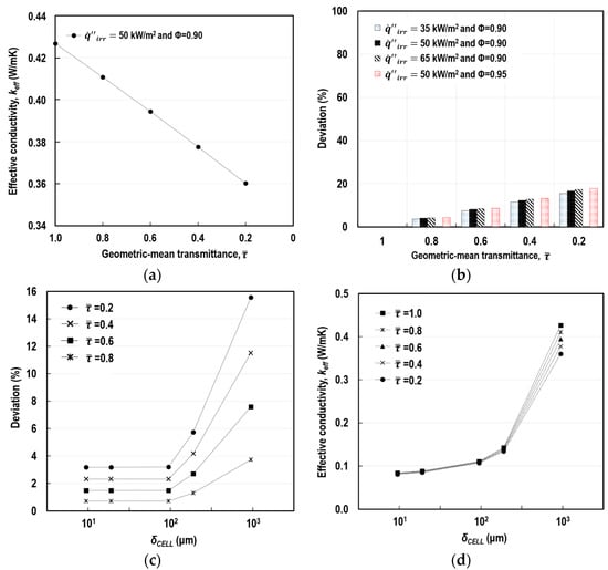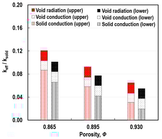 Figure 19 shows the variations in the ratio of keff to ksolid and the individual contributions of kc_solid, kc_void, and kr_void to the ratio, according to Φ. The greater the porosity, the lower the keff/ksolid ratio, and the more enhanced the thermal insulation performance of the porous medium. This tendency was induced by the considerable reduction of the solid-conduction contribution, which was associated with the decrease in the volume fraction of the solid-phase with the increase in Φ. With this decrease in the volume fraction of the solid-phase, an increase in the volume fraction of the void-space was produced. Little change, however, was observed in terms of the contribution of kc_void. This was closely related to the low intrinsic conductivity of the air compared to ksolid. With respect to kr_void, since δcell did not change in this case study, little variation was found in the contribution of kr_void, which was strongly dependent on pore size, as shown in Figure 17.