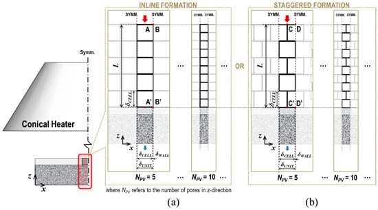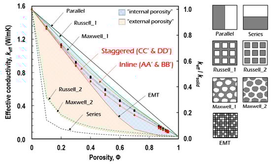 - The tortuosity of the solid skeleton was included by considering two outermost cases: inline and staggered configurations, as described in Figure 3. This approach enabled the prediction of the upper and lower limits of keff(Φ), which are applicable to the inorganic intumescent system.