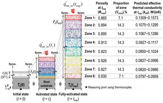 In general, the thermal conductivity of matter is a function of temperature and is conventionally measured based on the steady-state guarded hot-plate method (GHM) [] or the laser flash method []. In the case of a present intumescent substance, the physical measurement of its temperature-dependent thermal conductivity is highly problematic, as several thermo-physical properties that considerably affect the measurement of thermal conductivity vary during the course of measurement: the swelling as a reaction to a temperature rise, the length of the conduction transfer path (or thickness) increases, its porosity increases (or density decreases), and its heat capacity per unit envelope-volume decreases. As an alternative method, in this work, a numerical approach is introduced to define the keff versus temperature relation for the particular form of porous medium.