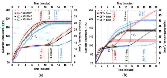Experimental measurements of substrate-temperature (Ts) and thickness expansion (ℓz) over time: (a) at DFT = 3 mm and (b) at = 50 kW/m2.