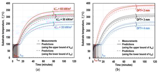 Figure 15 shows the measurements of Ts(t) and ℓz(t) under different conditions of irradiance () and dry-film coating thickness (DFT) as obtained from the CC tests. An important finding was that the full-expansion time texp was similar to the moment in time at which Ts re-increased after undergoing a short plateau. This indicates that, hereafter, Ts development was governed by the mechanism of heat transfer through the fully expanded coating (rigid porous residue). Therefore, the following history of Ts beyond texp can be used for the validation of the multicellular modelling. Figure 16 demonstrates both the Ts histories, physically measured from the cone calorimeter test and numerically predicted by the multilayer model coupled with the multicellular model. We found that the FEA model accurately and consistently predicted Ts(t) under the different conditions from the transient to steady states. Notably, the graphs in the shaded regions (<texp) are not directly related to this verification objective; these are associated with the process of the polymer’s mass and volume changes depending on temperature, which were thoroughly examined by Kang et al. [].