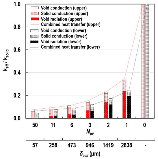 Figure 17 demonstrates the influence of δcell on the thermal insulation performance of porous structures. Its effect was quantitatively expressed by the ratio of keff to the true thermal conductivity of the solid-particle (ksolid). The contributions of kc_solid, kc_void, and kr_void to this ratio are also specified in each of the bars of the chart. The red and black colours denote the upper and lower bounds of the FEA predictions, respectively, derived from the four heat transfer courses (A-A’, B-B’, C-C’, and D-D’). At NPV = 0, heat was transferred via pure solid conduction. As NPV increased at a constant L, δcell reduced to around 60 μm and the ratio noticeably decreased to the range of approximately 0.075 to 0.065.