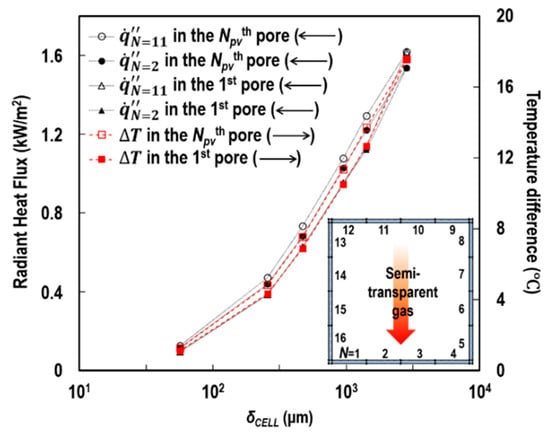 When the size of the cell was in millimetres (≳1000 μm), a large portion of the keff/ksolid ratio was accounted for by kr_void, whereas kc_void made a minor contribution. The reasons for these observations are that radiation is on the basis of the fourth power of the absolute temperature, and the true thermal conductivity of the air is much smaller than ksolid. However, the contribution of the cavity radiation was dramatically reduced with decreasing δcell. Around the determined δcell for the inorganic intumescent coating (200 μm), solid conduction became the major mode of heat transfer through the porous structure. We interpreted that with the decrease in δcell, the temperature difference between the hot and cold internal surface areas of RECs (i.e., ΔT) considerably narrowed. This trend caused a reduction in the net radiant flux () absorbed by each of the internal-surface areas, when being transported from one surface to another and vice versa within the RECs (Figure 10a). Figure 18 demonstrates the quantities of and ΔT on two internal surface areas with the highest and lowest temperatures (N = 11 and 2, respectively) of each of the two outermost RECs (NPVth and first RECs in Figure 10b). We found that and ΔT were less than approximately 0.4 kW/m2 and 4 °C at δcell = 200 μm.