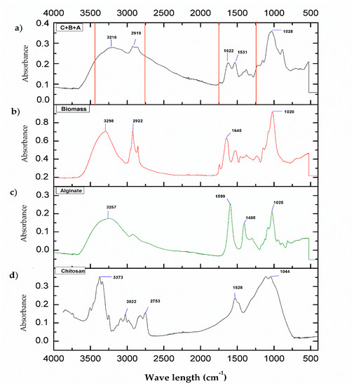 In Figure 2a, the spectra of the composite C+B+A is presented. As can be observed, there is stretching in the region between 2750 cm−1 and 3400, where –NH groups and –OH groups can be found. For the region of 622 and 1531 cm−1, stretching of C–O and –NH is found. The region of 1028 cm−1 corresponds to the stretching of C–O and C–C. Since chitosan is the major component of the composite, the majority of the interactions occur around it. TPP acts as a cross-linking agent between the biopolymers and the formation of the composite beads, which can be attributed to ionic gelation [31]. The charges of the –NH3+ groups of chitosan interact with the dissociated products of TPP in solution (P3O105− and HP3O104−); this interaction was described by Goycoolea et al. [32] during the synthesis of the chitosan-alginate-blended nanoparticles employed for the delivery of macromolecules. At the same time, it is considered that the chitosan –NH3+ groups will interact with the negatively charged –COO of the alginate and carboxylic groups of the fungal biomass. This can be due to a significant decrease that was found in the signal between 1600 and 1500 cm−1, which can be attributed to the interaction of amino groups with carboxylic and carboxylate groups [33]. It is possible to observe a signal near 1650 cm−1, which can indicate interaction with the carbonyl groups present in the biomass and in the alginate with the amino groups of the chitosan chain [34]. Fungal biomass possesses a great amount of hexamines and proteins, and these are among the main constituents of the fungal cell wall [35]. By adding the fungal biomass to the mixture, it is provided with additional –NH, –OH, and carboxylic groups that can interact in a similar manner to that of TPP, as described previously.