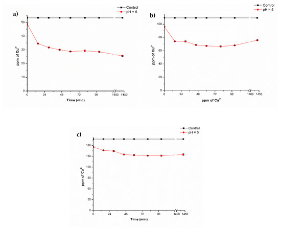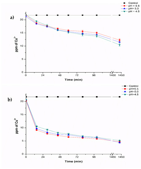 In Figure 3, the results of the biosorption kinetics are presented for fresh and lyophilized composite beads. For fresh composite beads, the copper concentration decreased in all of the pH evaluated (5.5, 5.0, and 4.5) (Figure 3a). The highest metal removal was observed at pH 4.5, decreasing copper concentration to a value of 10.48 ± 0.54 ppm of Cu2+ compared to the control (21.67 ± 0.07 ppm of Cu2+). This represents a copper removal of 51.8% (Table 1). Furthermore, at pH 5.5 and pH 5.0, a removal of 43.6% and 47.0%, respectively, was also achieved.