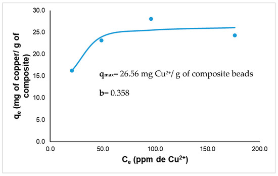In Figure 4b, for the concentration of 100 ppm of Cu2+, the concentration was reduced to a final value of 66.39 ± 0.87 ppm, and for 200 ppm of Cu2+, the concentration was reduced to 151 ± 0.74 ppm. This represents a removal efficiency of 52%, 39.3%, and 23.2%, respectively (Table 2). With the results obtained in this kinetic, the Langmuir model was applied (Figure 5, Table 2) and analysis showed that the amount of copper that the composite beads could adsorb was higher with increasing copper concentration. Notwithstanding a decrease in removal efficiency (%) was observed for biosorption process, but this could be due to the increase in Cu2+ concentration; nonetheless, a higher amount of metal was adsorbed for each concentration evaluated.