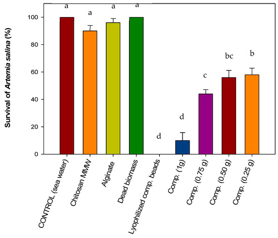 The acute toxicity test with A. salina nauplii was carried out based on the method of Molina-Salina and Said-Fernández [22]. In order to hatch A. salina eggs, 5 g of eggs was placed in Erlenmeyer flasks with sterile seawater. Aeration was maintained with an air pump from a fish tank, artificial illumination was turned on for 24 h, and the temperature was maintained at 25 °C. After hatching, the nauplii of A. salina were separated into groups of 10 specimens. Each group was placed in test tubes containing 5 mL of seawater and the substance to be tested (water from biosorption kinetics, 1 g of CMMW beads, 1 g of alginate beads, 0.25–1.0 g of CMMW-fungal biomass-alginate composite beads). Nauplii of A. salina with only seawater served as control. The test tubes were maintained under illumination for 24 h. After the incubation period, the surviving nauplii were counted with the aid of a magnifying glass and the percentage of survival was determined.