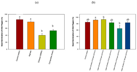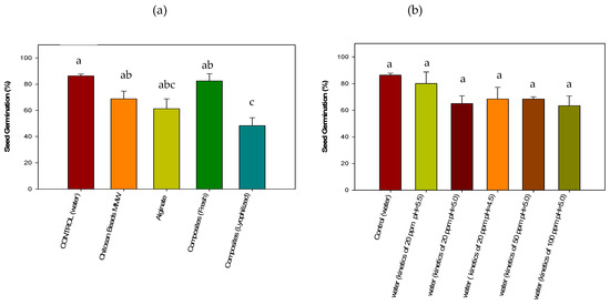 Chili pepper seeds germinate at a pH of 6.8–7.5 [58], which could explain the low germination in the seeds. In the case of the cross-linked composite bead, the presence of the biomass does not appear to exert an effect on seed germination compared to the assay with lettuce seeds, and it is considered that chili pepper seeds were those most affected by the pH of the composite beads. However, root elongation was less affected (0.43 ± 0.03 cm) compared with the treatment with pure CMMW beads.