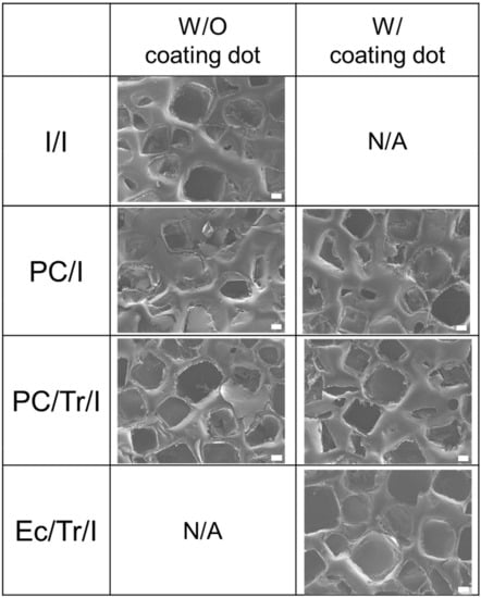 Figure 2 shows the SEM images of the implant surfaces, which exhibited square-shaped microwells due to the inherent textured surface of the implant shell used in this work (SFS-LP, Hans Biomed, Seoul, Korea). For the coated samples, the surface morphology was not very different between the surfaces with and without the coating dots, implying a thin layer of the coatings prepared in this work. For the PC/Tr/I, the drug loading amount was measured to be 284.39 ± 1.25 μg, which increased to 1389.07 ± 9.18 μg for the EC/Tr/I as more drug-loaded drops were utilized to coat the entire surface of the implant sample.