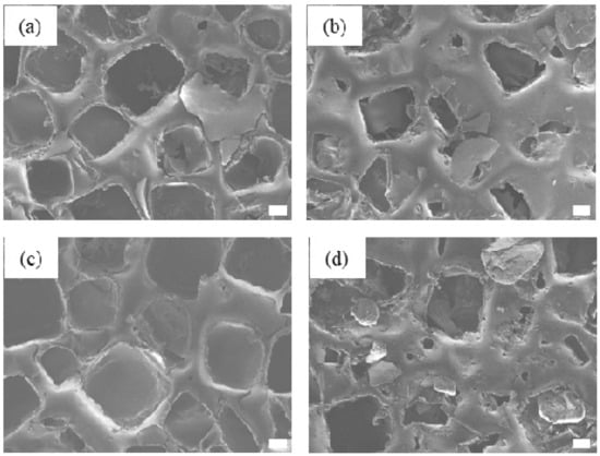 SEM images of the coatings before and after mechanical stress. The PC/Tr/I (a) before and (b) after mechanical stress and the EC/Tr/I (c) before and (d) after mechanical stress. Scale bars are 100 μm.
