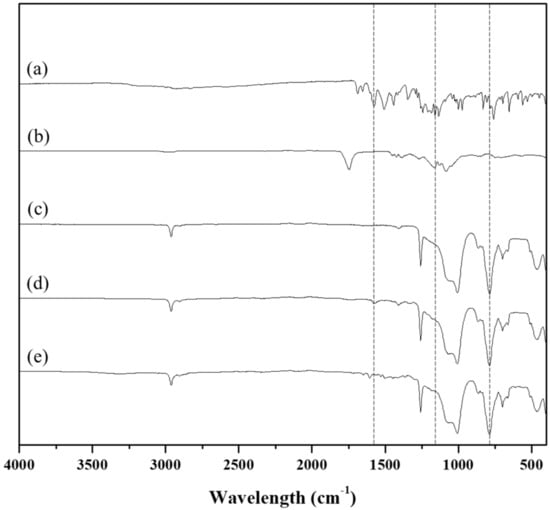 ATR-FTIR spectra of (a) intact tranilast, (b) intact PLGA, (c) I/I, and the surfaces of the PC/Tr/I (d) with and (e) without the coating dot. The dashed lines show the characteristic peaks.