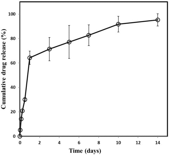 We performed an in vitro drug release study with the PC/Tr/I, as shown in Figure 5. There was an apparent initial burst release of 60.15% ± 7.5% on the first day, which could be due to the higher drug distribution near the surface of PLGA coatings [,,]. Afterwards, the drug was released in a sustained manner at a rate of approximately 2.56%/day until 14 days, indicating diffusion-mediated release of the drug encased in each of the coating dots of the PLGA matrix. When tested with fibroblast cells, the coating dots prepared in this work did not exhibit a statistically significant difference in cell adhesion compared with the intact silicone surface of the implant in clinical use (Figure S2).