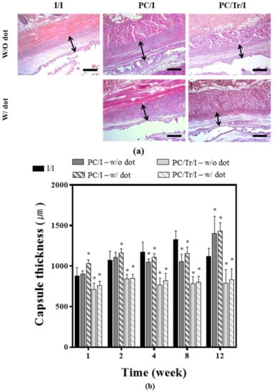 Evaluation of capsule thickness 12 weeks after sample implantation. (a) Representative H&E-stained tissue images observed at 12 weeks, where the double-ended black arrow indicates the capsule thickness. Scale bars are 1 mm. (b) Profiles of capsule thickness. * Statistically significant difference from the I/I (p < 0.05). Error bars are the standard deviation.