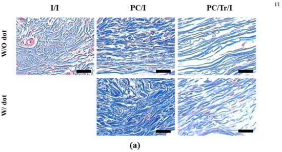 It should be noted that for the PC/Tr/I, all parameters evaluated under the present in vivo experiments were not significantly different between the tissues over the surfaces with and without the coating dots (Figure 6, Figure 7, Figure 8 and Figure 9). This result implied that the drug released from each of the coating dots spaced at the distance employed in this work could still cover and effectively reduce fibrotic tissue formation over the entire surface. All tested samples herein did not exhibit any apparent complications due to well-known biocompatibility of PLGA [,] and proven safety of the silicone implant used in this work (SFS-LP, Hans Biomed, Korea).