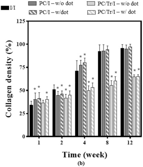 Evaluation of collagen density 12 weeks after sample implantation. (a) Representative MT-stained images observed at 12 weeks. Scale bars are 200 µm. (b) Profiles of collagen density. * Statistically significant difference from the I/I (p < 0.05). Error bars are the standard deviation.