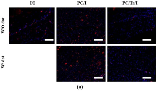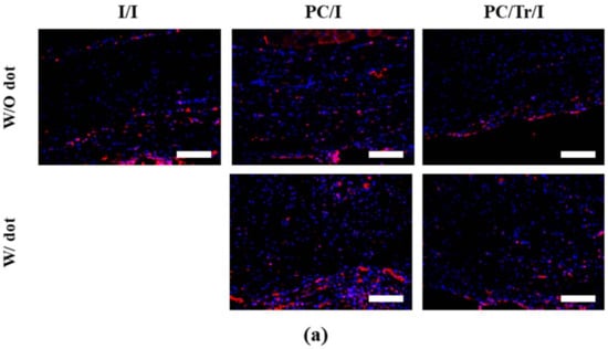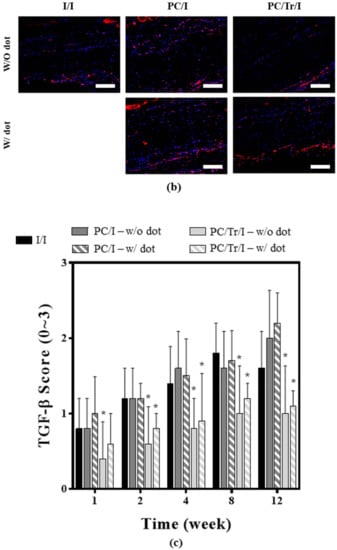 The stained slides were then examined by a professional pathologist in a blinded manner. For the I/I group, five images were randomly selected at each time of biopsy per animal group. For the PC/I and PC/Tr/I groups, five images were randomly selected for the tissue over the implant surface with or without the coating dot, thereby a total of 10 images at each time of biopsy per animal group. To assess the fibrotic capsule thickness, the H&E-stained slide was observed with an optical microscope (Carl Zeiss, Oberkochen, Germany) at 50× magnification, where the capsule thickness was measured from the muscle layer to the surface adjacent to the implant [,]. To evaluate the collagen density, TGF-β, and fibroblasts, the tissues in the capsule were observed at a higher magnification (200×). For assessment of the collagen density, the area of blue-colored collagen was measured as a percentage of the whole area of the image of the MT-stained slide []. For evaluation of TGF-β and fibroblasts, the IF-stained image was observed with a fluorescence microscope (Imager A1; Carl Zeiss, Oberkochen, Germany), and the cells with double positive signals for DAPI and a corresponding antibody were semiquantitatively analyzed as follows: 0; None, 1; Mild, 2; Moderate, and 3; Severe [].