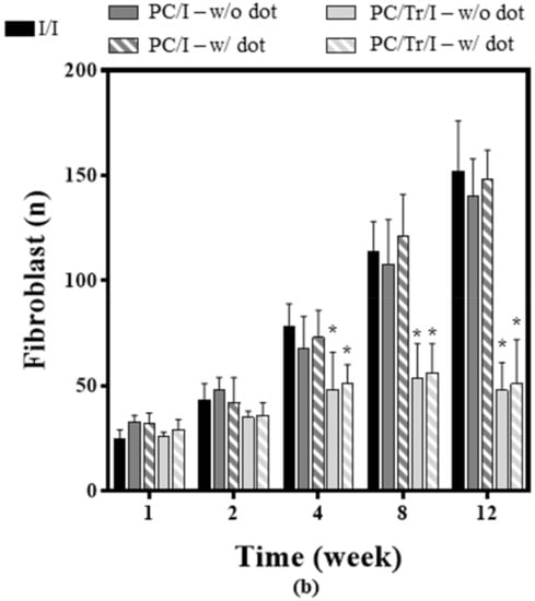 To further examine the efficacy of the drug, tranilast, we also sought to analyze the degree of TGF-β, as shown in Figure 8. The TGF-β expression was clearly lower in the PC/Tr/I than in the I/I and PC/I due to the presence of tranilast, a TGF-β inhibitory drug. Interestingly, this effect continued until 12 weeks, although the drug was almost depleted within two weeks (Figure 5). This finding could be explained by the cascading events from the acute to chronic stages of inflammation, as reported in our previous work []. Inhibition of TGF-β at the early stage of inflammation would decrease the number of monocytes, and thus, the macrophages that differentiated from monocytes would also decrease at the later stage of inflammation even without the presence of tranilast. During chronic inflammation, macrophages play a critical role in secreting TGF-β [], and hence, a decreased number of macrophages could result in less TGF-β. Therefore, fewer fibroblasts were observed to be recruited with the PC/Tr/I, as shown in Figure 9. The number of fibroblasts was significantly lower for the PC/Tr/I than for the I/I and PC/I from 4 weeks. The lower number of fibroblasts, along with less TGF-β, appeared to cause less collagen synthesis (Figure 7) and hence smaller fibrotic capsules (Figure 6).
