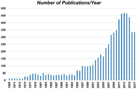 Graph representing the number of peer-reviewed journal articles (found in SciFinder) describing flame resistant (FR) polymers per year between 1969 and 2017.