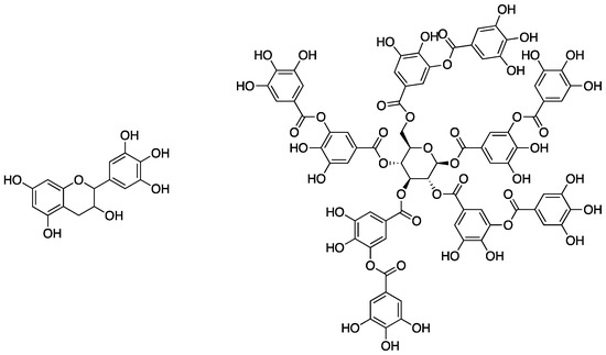 Molecular structures of a condensed tannin monomer (left) and a hydrolysable tannin (tannic acid, right).