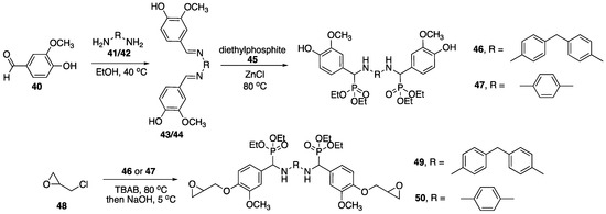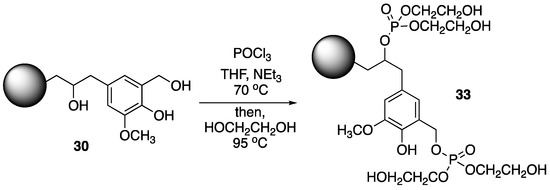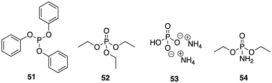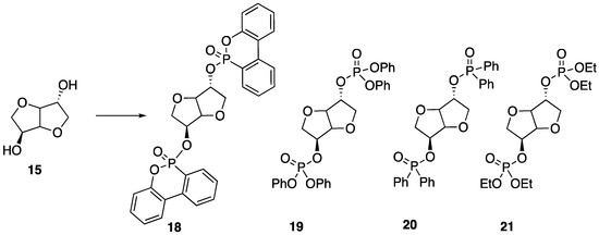 Recently, Howell and Daniel [49] were able to synthesize a variety of phosphate esters (18–21) from isosorbide that could be used as FR additives for epoxy resins (Figure 12). The phosphate esters could easily be prepared directly from isosorbide through reaction with the respective phosphoryl chloride.