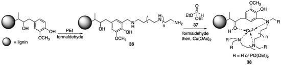 Within the polymer industry, vinyl polymers make up a large bulk of the market, of which, polyacrylonitrile (PAN) is an important commodity in which acrylonitrile is often incorporated as a comonomer with monomers such as styrene [40]. Recently, Ren and coworkers [41] utilized a sol-gel process to prepare new FR organic–inorganic hybrid coatings that can be applied to PAN fabrics. Sol-gel processes usually involve the hydrolysis of reactive inorganic monomers in solution (“sol”) that can then condense to form crosslinked network (“gel”) that can be molded and shaped. The hydrolysis and subsequent reaction of tetraethoxysilane 13 is a classic example. In the current study, the authors applied this process to the preparation of a synergistic FR coating through the combination of 5, urea 14 and 13 as a sol which was then used to coat PAN fabrics and allowed to gel (Figure 10).